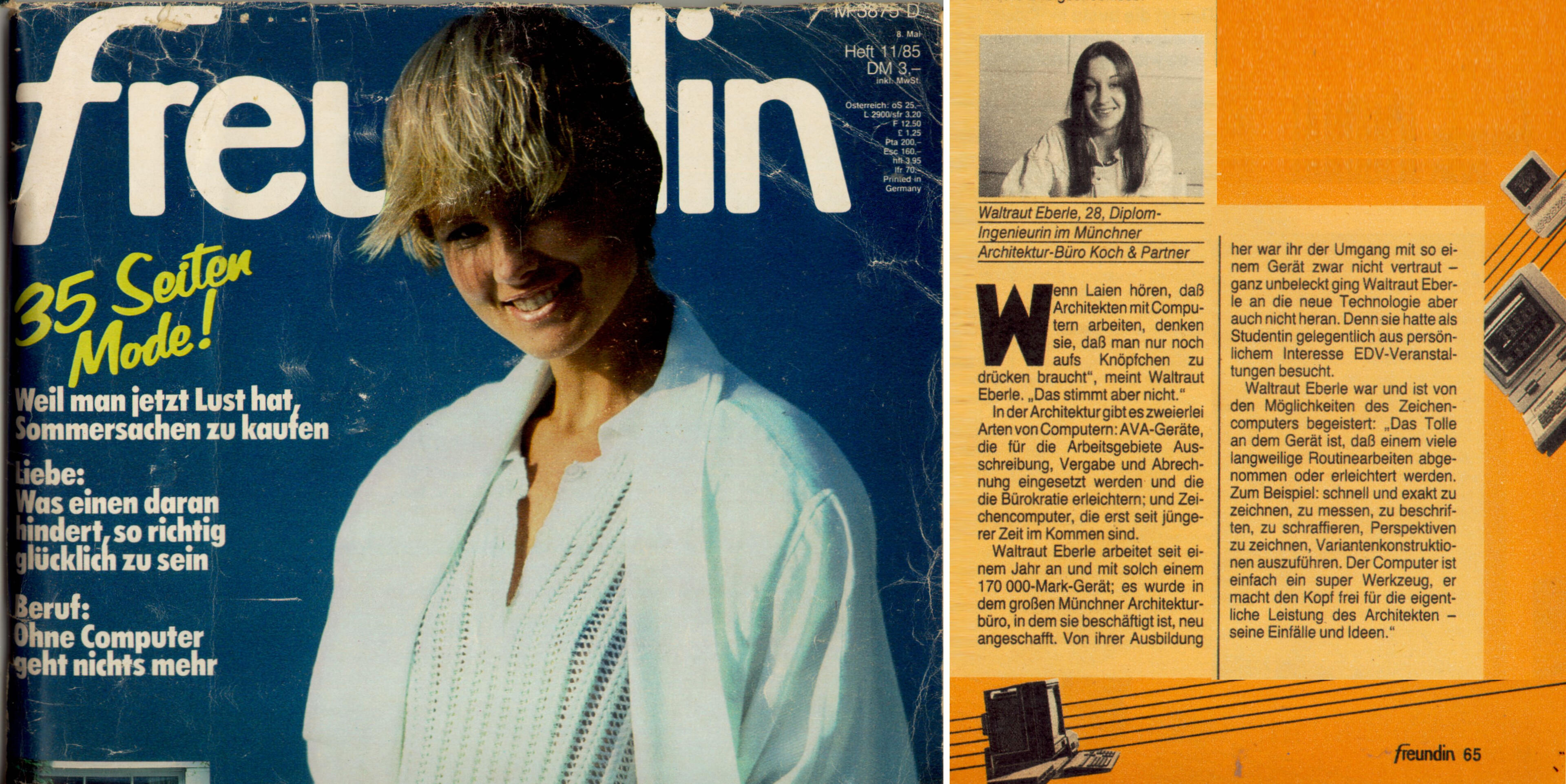 Mit Koch+Partner verband mich eine langjährige vertrauensvolle Zusammenarbeit, die mehr als ein Viertel Jahrhundert andauerte.1981, nach meinem Vordiplom, machte ich als Studentin, in dem am Kaiserplatz 8 in München ansässigen Architekturbüro, meine ersten Berufserfahrungen. Vorwiegend wurde ich für perspektivische Darstellungen, die bei der Teilnahme an Wettbewerben erforderlich waren, eingesetzt: 1)Zahnradfabrik Friedrichshafen, 2)BMW Forschungs- und Industriezentrum München, 3)BMW AG Berlin Uhlandstraße, 4)Mercedes NL Stuttgart, 5)Marienhof München, 6)Landratsamt München, 7)Postsparkassenamt München, 8)Stadtsparkasse München im Tal, 9)BMW AG Petuelring München, 10)Neue Messe München, 11)Stadthalle Laufen an der Salzach.Ab März 1984, nach meiner Diplomprüfung, blieb ich weitere 4 Jahre in der mir schon vertrauten Umgebung und arbeitete als freie Mitarbeiterin für Koch+Partner bei verschiedenen Projekten mit: 1Verwaltungsgebäude der Rückversicherungsgesellschaft Frankona, 2Maschinenhaus Klärwerk München II, 3Siemens Werkhallen Augsburg, 4BMW-Werkschutzgebäude MünchenZu jener Zeit war es in München die große Sensation schlechthin: Koch+Partner hat sich als erstes Münchner Architekturbüro einen CAD-Arbeitsplatz samt externer Festplatte von 10 MB und einem Plotter, Gesamtkosten 170 Tsd. DM, angeschafft. Meine Aufgabe war es dieses neuartige Gerät bedienen zu lernen und die Genehmigungsplanung für das Projekt 5Arbeitsamt Augsburg (50 Mio.DM), 115x70m, 5-Geschosse+Kellergeschoss, zu zeichnen. Aufgrund des östlich an das Grundstück angrenzenden Senkelbaches, hatten 2 Fassaden des Gebäudes eine geschwungene Form und die Zeichnungen wären mit einem Kurvenlineal nicht leicht zu bewerkstelligen gewesen, mit der neuen Technik jedoch schon.